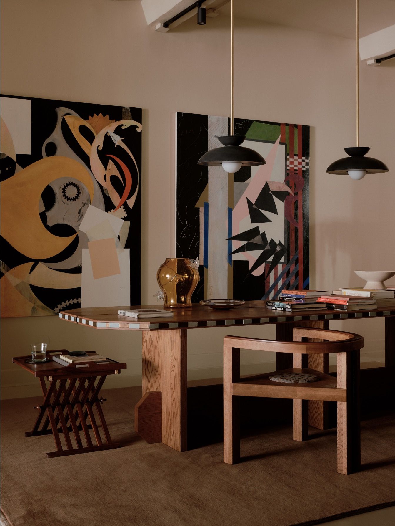 Pictured above, The Augustus Orb Pendant in Blackened Brass. Brion Chair in Oiled White Oak and Custom Table 120” x 60”.